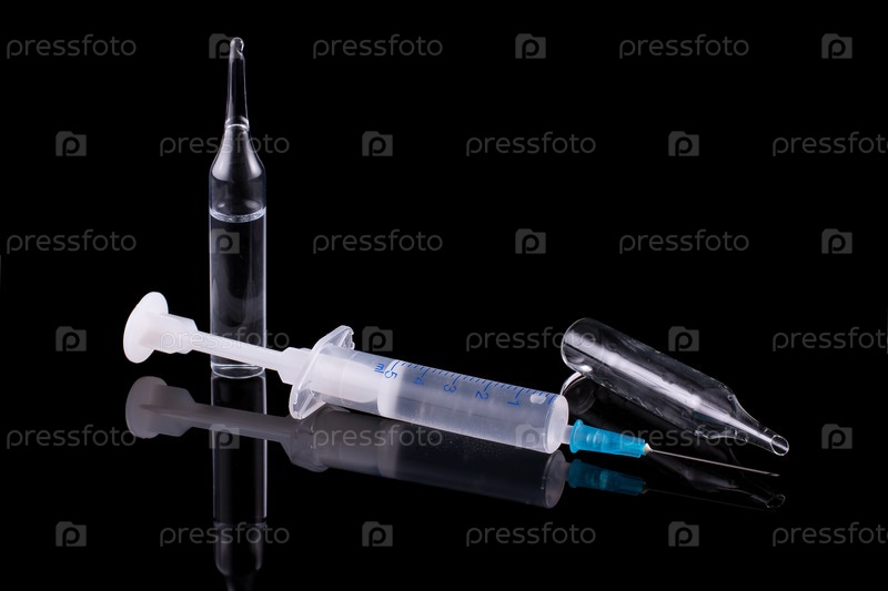 Медицинский шприц и стеклянная ампула на черном фоне