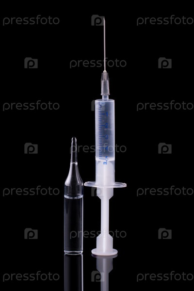 Медицинский шприц и стеклянная ампула на черном фоне