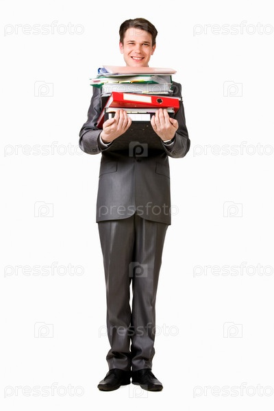 Фото успешного мужчины с кучей бумаг, смотрящего в камеру