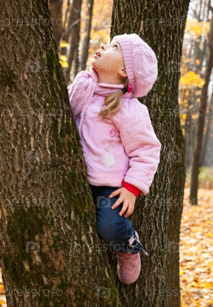 Маленькая девочка на дереве в осеннем парке