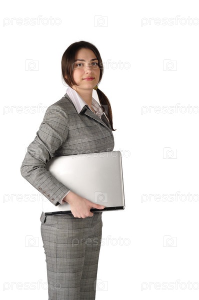 Молодая и красивая бизнес-леди с ноутбуком в руках на белом фоне