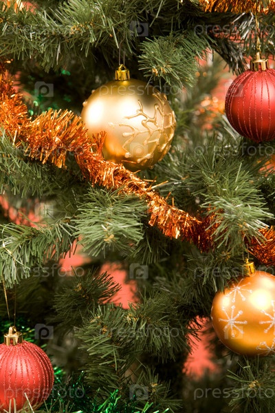 Близкий план рождественской ёлки, украшенной шляпой Санты и игрушечными шарами