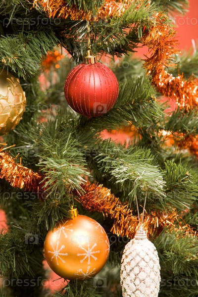 Близкий план рождественской ёлки, украшенной шляпой Санты и игрушечными шарами
