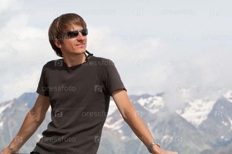 Молодой человек наслаждается видом высоко в горах