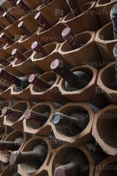 Италия, Сицилия, старые бутылки красного вина в винном погребе