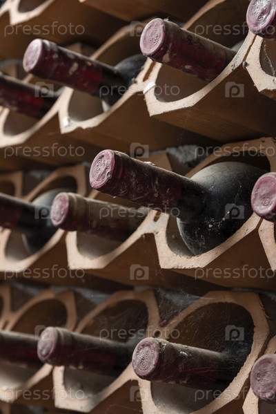 Италия, Сицилия, старые бутылки красного вина в винном погребе