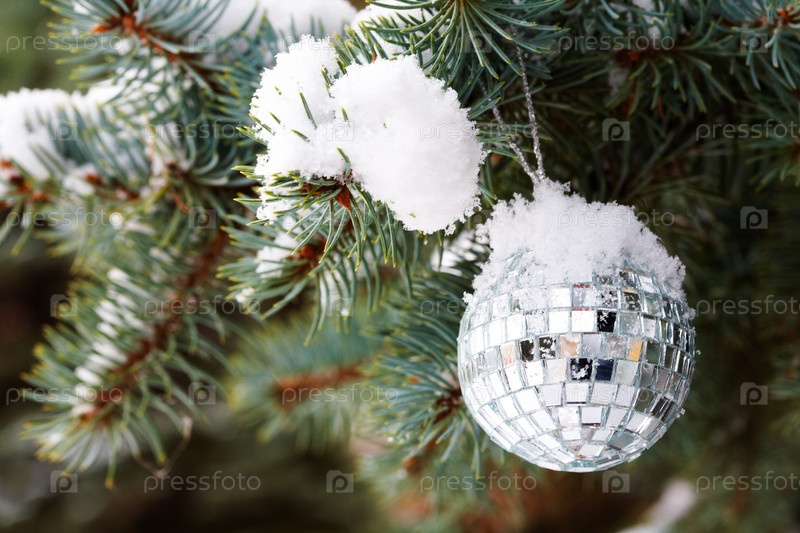 Изображение зеркального декоративного игрушечного шара, висящего на ветке елей с снегом