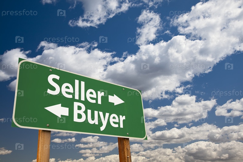 Продавец, покупатель. Зеленый дорожный знак на фоне облаков