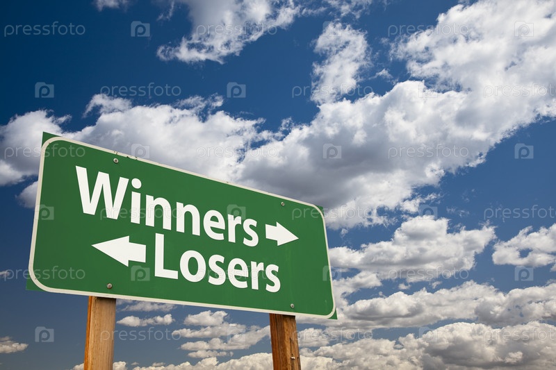 Победители, проигравшие. Зеленый дорожный знак на фоне облаков