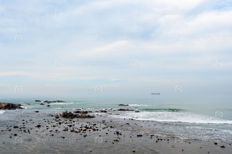 Каменистые берега, небо и море в тумане