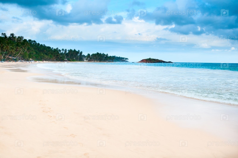 Тропический пляж с облачным темно-синим небом