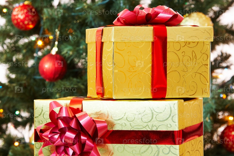 Близкий план двух подарочных ящиков на фоне украшенной рождественской елки