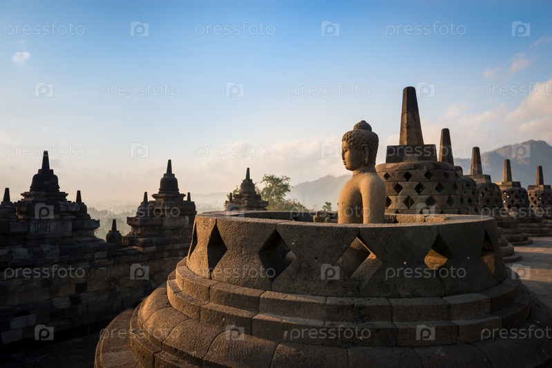 Будда в храме Боробудур на восходе солнца. Индонезия