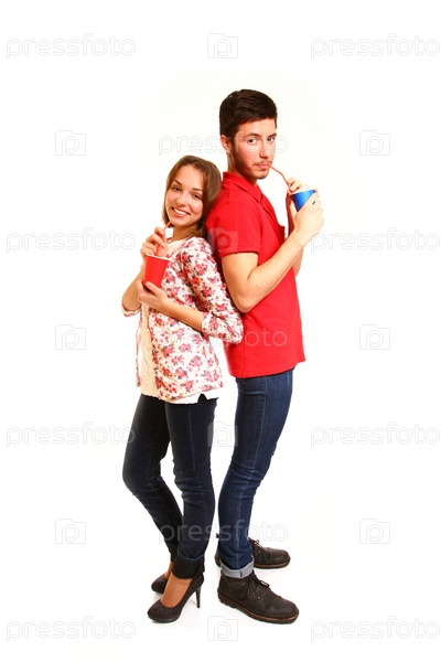 Романтическая молодая пара пьет, изолированная на белом фоне