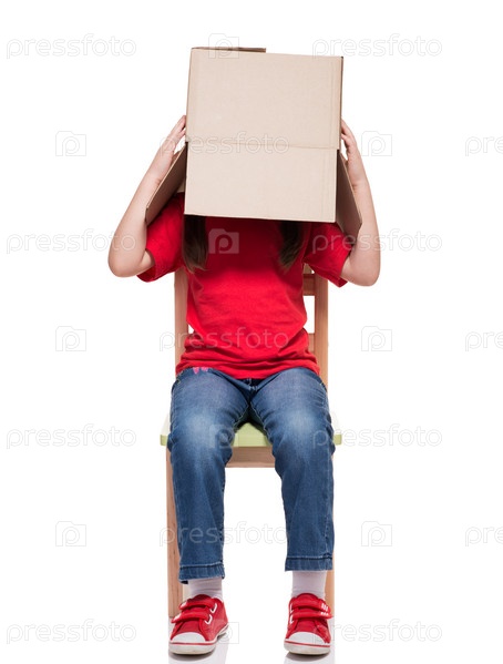 Маленькая девочка на стуле с коробкой на голове