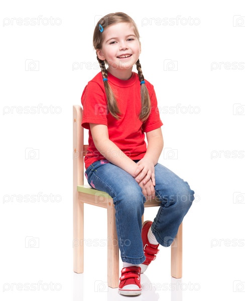 Маленькая девочка в красной футболке позирует на стуле