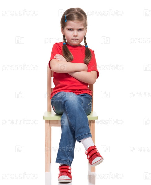 Девочка в красной футболке позирует на стуле