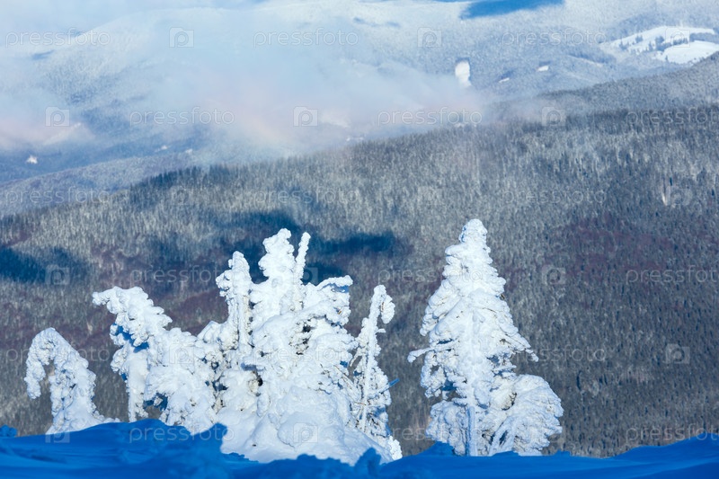 Зимний горный пейзаж с заснеженными деревьями