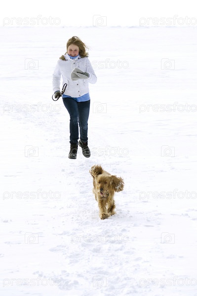 Девушка на прогулке со спаниелем