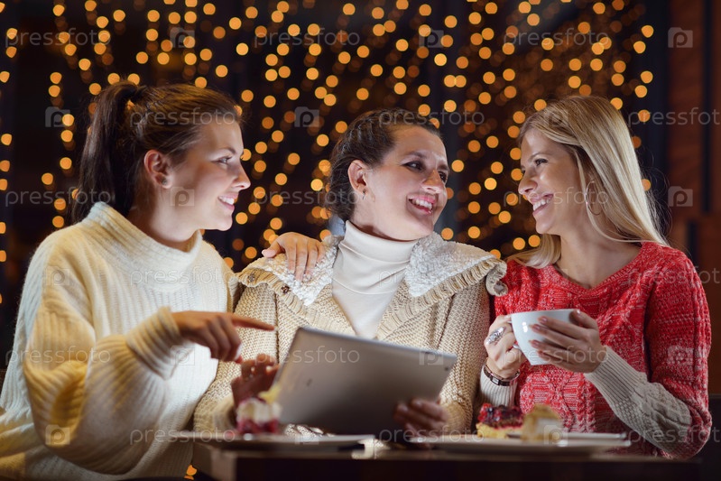 Группа счастливых девушек, смотрящих на планшетный компьютер