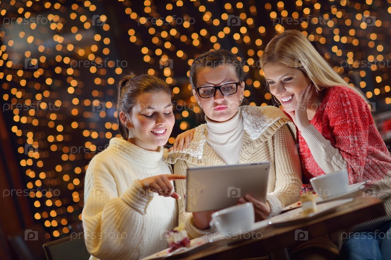 Группа счастливых девушек, смотрящих на планшетный компьютер
