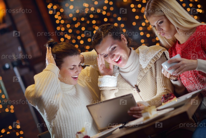 Группа счастливых девушек, смотрящих на планшетный компьютер