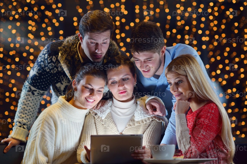 Группа счастливых людей, смотрящих на планшетный компьютер