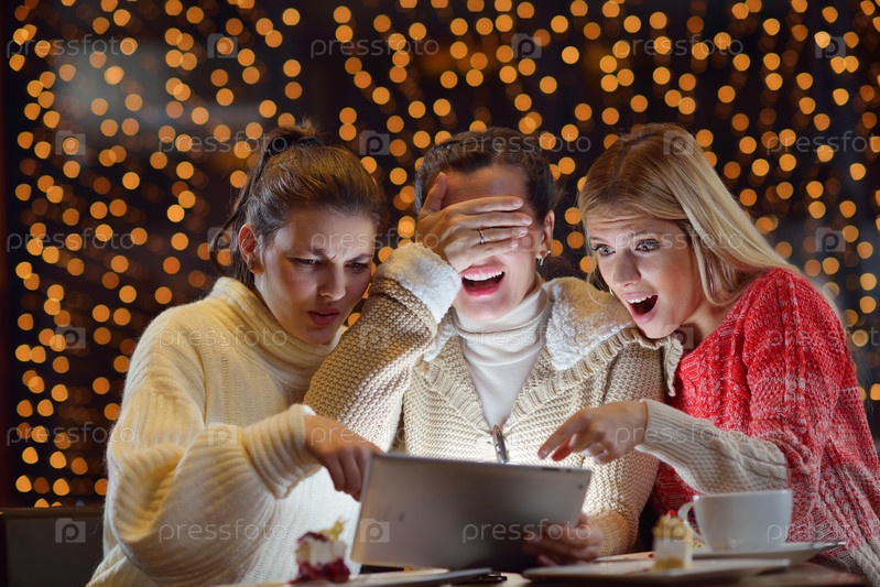 Группа счастливых девушек, смотрящих на планшетный компьютер