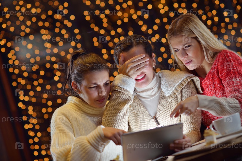 Группа счастливых девушек, смотрящих на планшетный компьютер