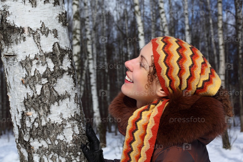Молодая красивая женщина в березовом лесу зимой