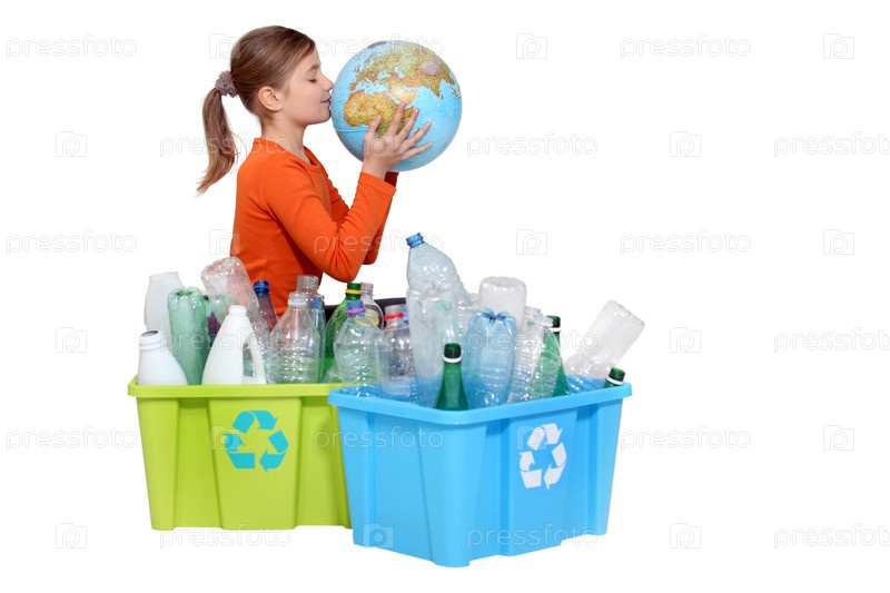 Девушка утилизирует бутылки и целует глобус