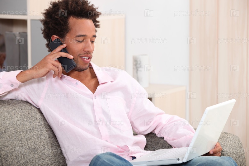Молодой человек говорит по телефону, сидя на диване с ноутбуком