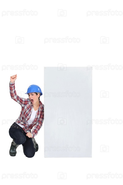 Радостная женщина-строитель стоит на коленях у пустого плаката