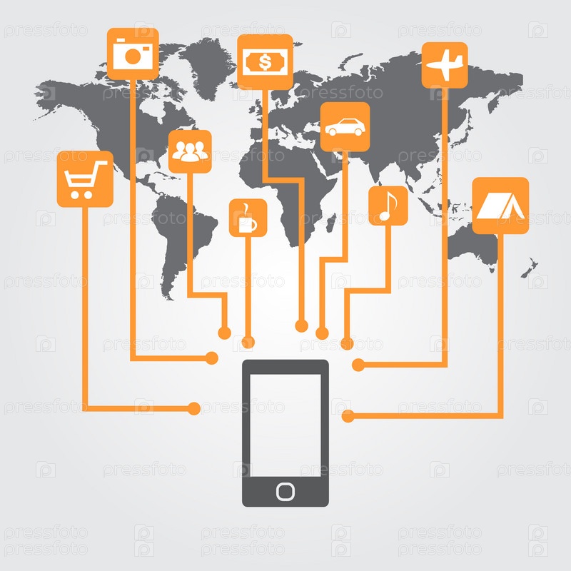 Смартфон с иконами на карте мира