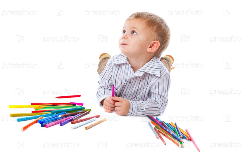 Ребенок с карандашами белом фоне