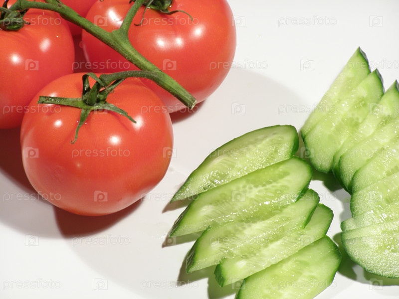 Помидоры и дольки огурца на белом фоне