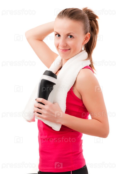 Молодая женщина после тренировки на белом фоне