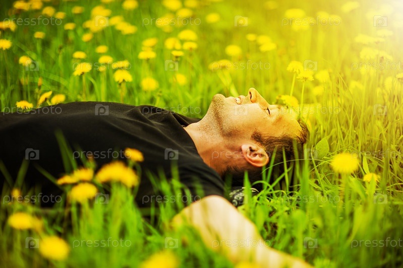 Мужчина лежит на траве в солнечный день