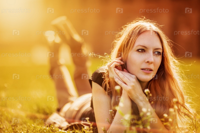 Красивая женщина лежит на траве