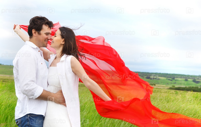 Молодая счастливая пара с красной тканью в летний день