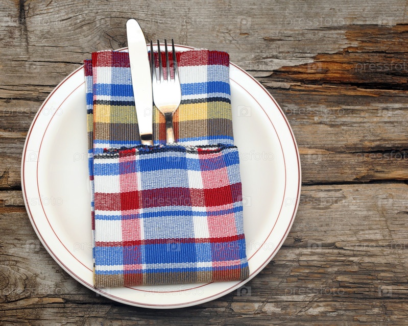 Пустое блюдо, нож, вилка и красочная салфетка на деревянном столе