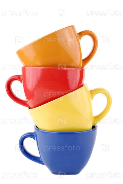 Четыре яркие глиняные чашки на белом фоне