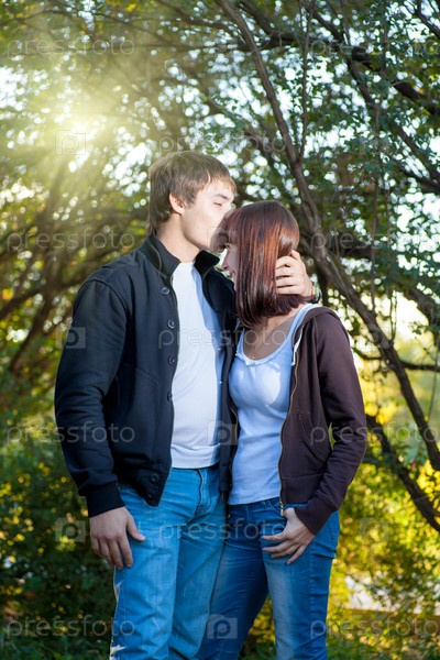 Влюбленная пара в парке на фоне зелени