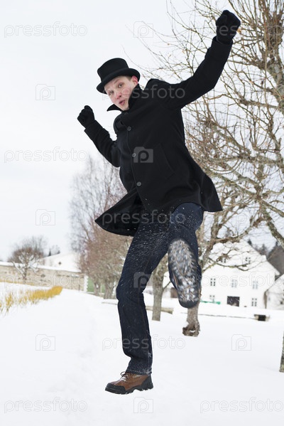 Мужчина в прыжке пытается пнуть врага