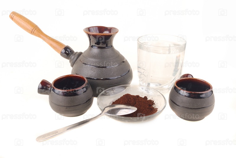 Турка, кофейные чашки, стакан воды и кофе на белом фоне