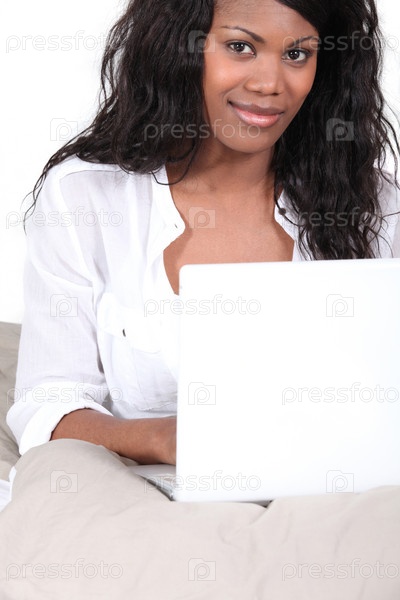 Женщина использует свой ноутбук в постели