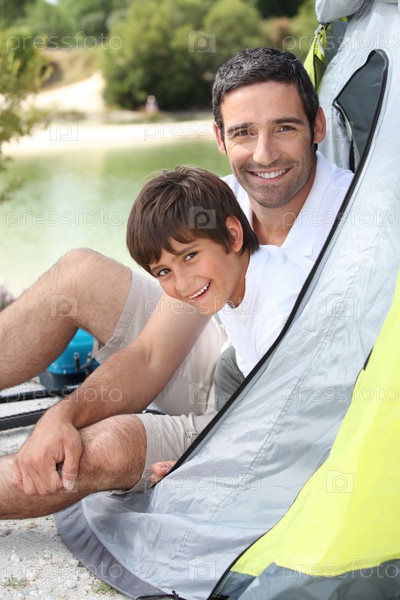Отец и сын на берегу озера