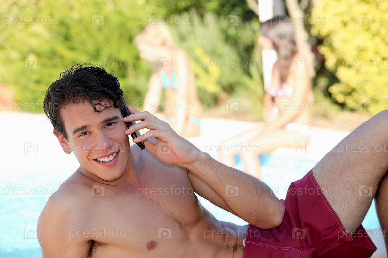 Молодой мужчина говорит по мобильному телефону в бассейне