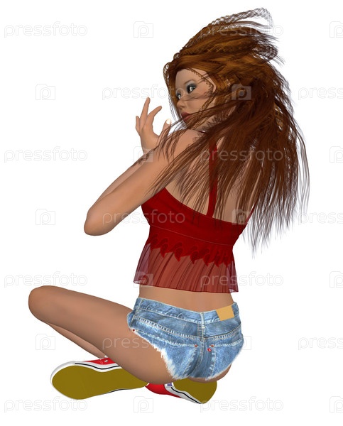 Сидящая брюнетка в красном топе