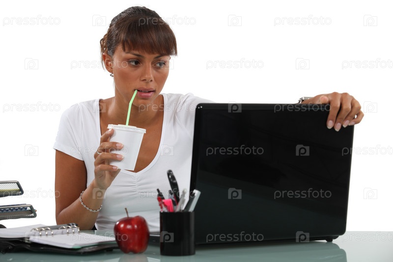 Деловая женщина пьет за столом